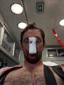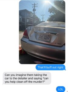 I won’t belabor the experience, but will leave it at I had a bad bike crash. That was with a parked car, and resulted in me being thrown face first into the back windshield, getting knocked out/breaking my left tibia, and my bike being thoroughly trashed. Moderate physical damage to me, the bike, and the car. You can see that perfect face-sized crater.