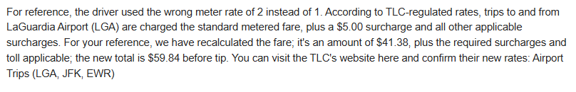 The now-corrected fare was $41.38 + taxes/fees (total: $64.84 including tip). That’s still healthy and substantial, but not downright outrageous. In the end I was refunded $23.62, which paid for our bagel and coffee breakfast snack. Thank you TLC (look, regulation done right, enforcing consumer rights!)