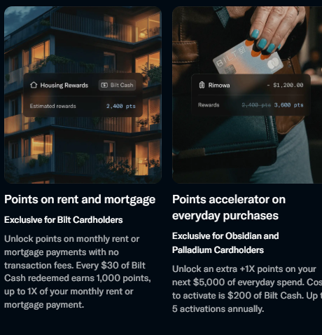 This is where the card gets interesting. There is a base rewards earn, but there’s also are “boosts” from mortgage payment Bilt cash redemptions AND/OR points-accelerator.