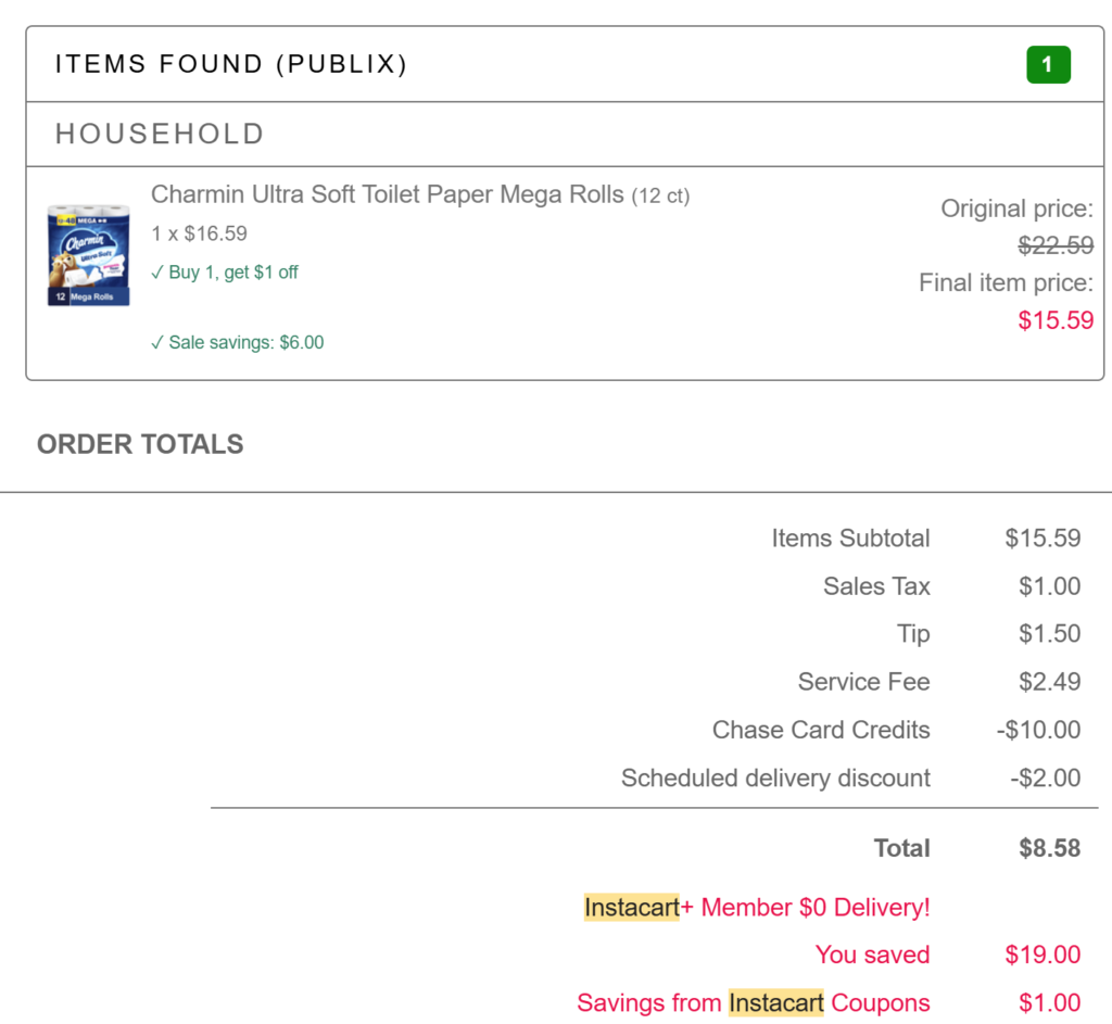 This is the perfect no-nonsense partnership. Effectively every Chase card has a combined free trial of Instacart+ and a monthly credit. While I don’t love using delivery (or pickup) for orders in general, I’m all for it if it’s actually cheaper. This is.