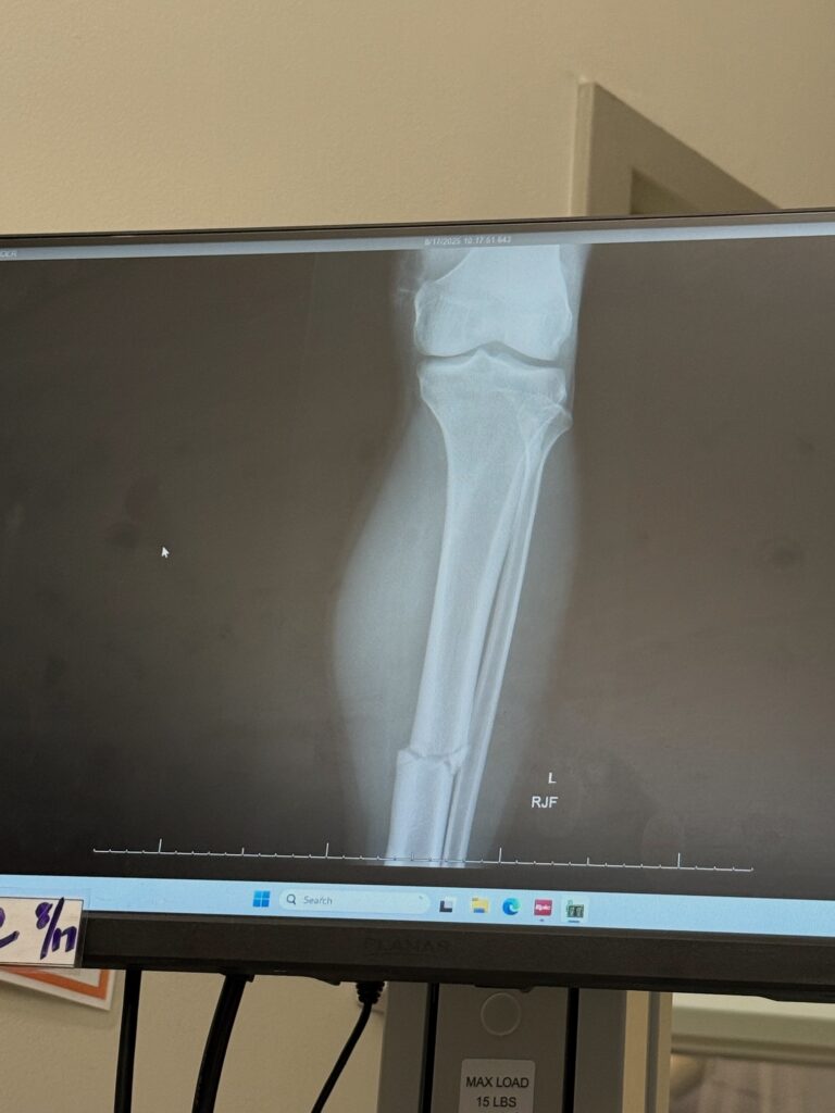 The Surgery. Unsurprisingly, I was admitted to the hospital. There was a potential for same-day surgery, but ultimately this occurred at 8AM the following morning (Monday). The procedure itself is a bit terrifying (I learned more post-surgery, probably for the best), drilling the bone from top to bottom, “reaming” a titanium rod in there, and screwing (locking) it into the ankle and knee. This provides both stability and strength to promote healing and almost immediate use. I was out of surgery by early afternoon, and back in the room shortly after. Total time: overnight stay + a few hours