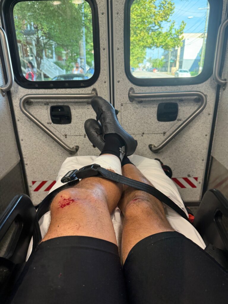The ambulance. Ten minutes post-accident they were on scene, had me loaded up, and I was on my way to VCU. They got me out of my delightfully tight socks, stabilized my facial bleeding (split lips pour blood), and made sure my very-broken leg was immobile. Given the extent of my injuries I was taken to the Richmond Trauma center, rather than the local hospital just a few blocks from my accident. Total time: 15 minutes.