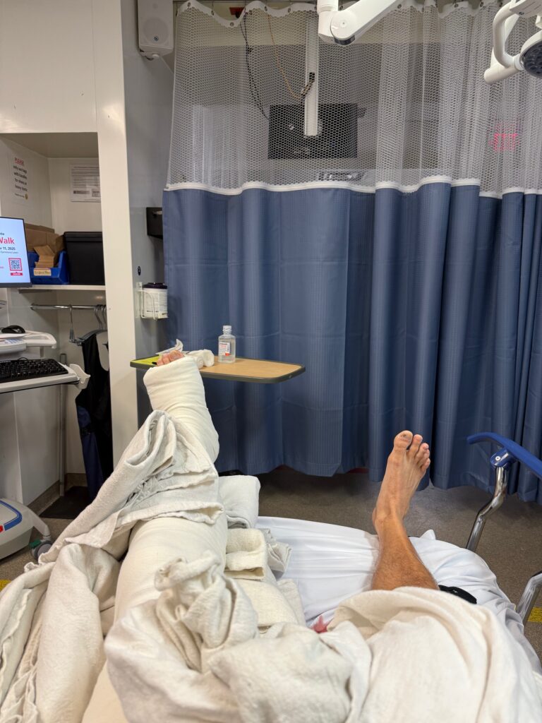 The ER. I’ve been a patient at an now ER 3 times in my adult life. This is by far the most severe. There were what felt like a dozen hands getting me situated, stabilized, x-rayed, drugged, stitched, glued, and even throwing in the occasional healthcare humor to keep the situation lighthearted. The core injuries were a very broken nose, a very split lip, general road rash, and a very, very broken leg. They were so efficient and professional, I genuinely could not have wished for better care. I quickly had a plastics surgeon stitch my nose, straighten my lip. I had doctors splint and wrap my leg to ensure I didn’t hurt myself further. I was then ushered off to a more private space before being admitted to the hospital. Total time: a few hours