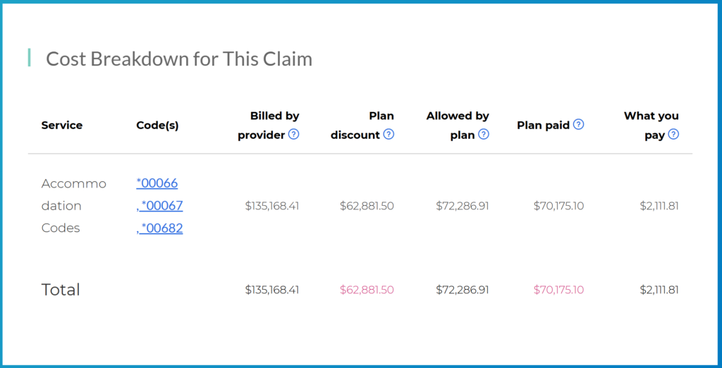 - 30% Co-insurance & $4,000 Out-Of-Pocket-Max – After you hit the deductible, this is what percentage you pay of the negotiated rate (30%) up to the total maximum ($4,000). My care was over $70k (billed $135k for the non-emergency care alone, see photo), and so I am responsible for 30% of that total, but maxed out at $4,000 ($3,000 incremental to the $1,000 deductible)