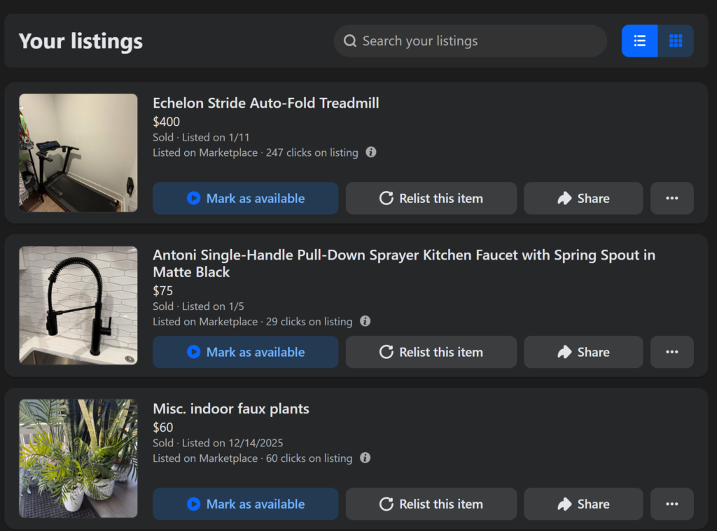 I’ve had what I consider remarkable success leveraging this built-in functionality to take a few photos of an item, relatively quickly find a buyer, and coordinate pickup. Even once I have had a successful shipping experience (think eBay), although that was by my own negligence of setting the sale up wrong. Everything from cars to cords of wood is fair game. And beyond the questionable responsiveness of prospective buyers and sellers, it’s been a helpful tool for avoiding some landfill and/or Goodwill donations.