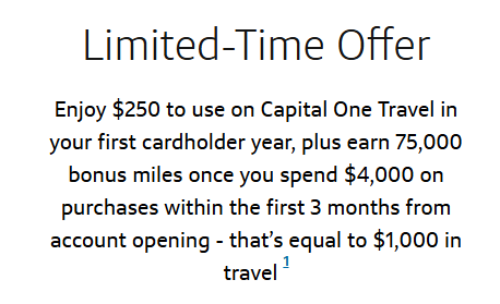“Enjoy $250 to use on Capital One Travel in your first cardholder year, plus earn 75,000 bonus miles once you spend $4,000 on purchases within the first 3 months from account opening – that’s equal to $1,000 in travel.”