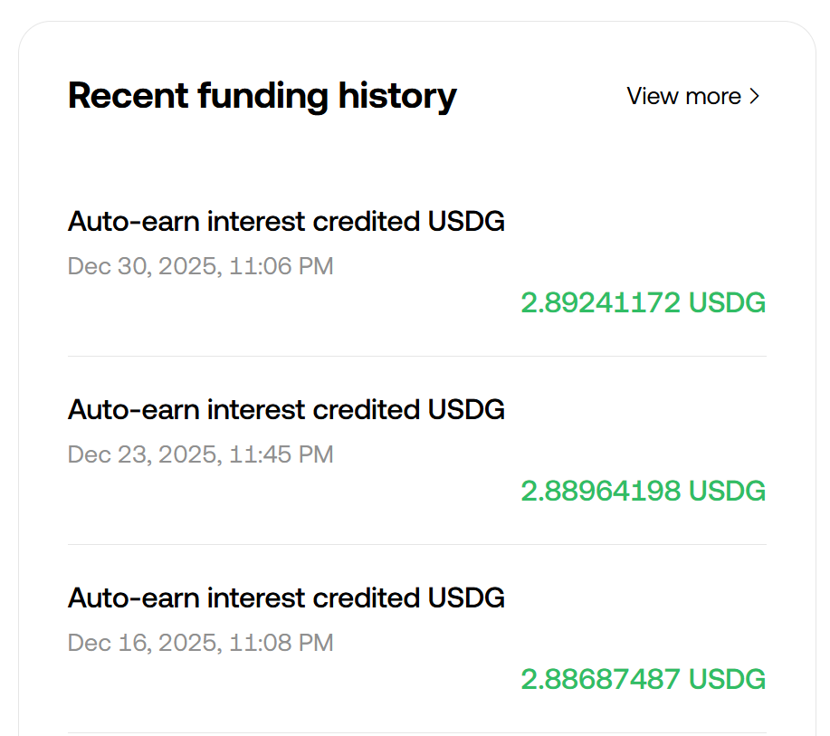- Funds aren’t forced into traditionally highly speculative crypto. The ploy of “stablecoins” is there no risk. That’s not quite true, but I would say the 1-1 pegging with USD and stated philosophy of predictable value & investment means it’s much less risk than holding a balance in something like Bitcoin. There’s some second-rate accountant somewhere making sure nothing fishy is going on.