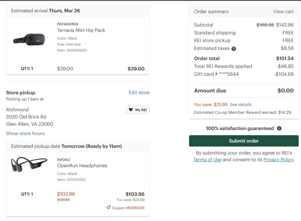 - REI dividend/rewards – 10% of purchases annually are returned as a gift card to REI members. This is on top of the 5% back on REI purchases on the credit card. This saved me $46.85 on my transaction