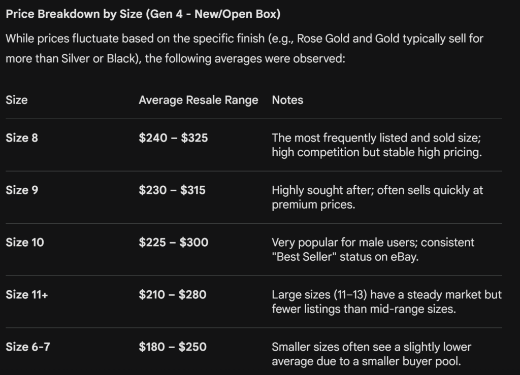 - Using a little Google Gemini, I found the highest average sale price for a New In Box Oura Ring was ~$240 for size 8 silver ring (I spot checked this for completed listings and found the takeaway generally reasonable)